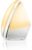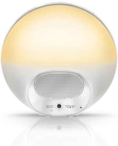 Das Wake-up Light HF3510/01 verfügt über ein digitales FM Radio und hat daneben drei auswählbare Wecktöne, nämlich Vogelgesang, Vogelkonzert im Wald und Zen-Garten. Die Display-Helligkeit lässt sich über einen Regler auf fünf verschiedene Stufen einstellen. Es lässt sich bei dieser Variante des Wake-up Light nur eine Weckzeit einstellen. Erwartungsgemäß gibt es auch eine Schlummerfunktion, bei der der ausgewählte Weckton alle neun Minuten zu einem erneuten Weckversuch ansetzt. Die Lampen des Geräts, für die Philips eine Lebensdauer von über 4.000 Stunden angibt, senden keine UV-Strahlen ab und sind somit vollkommen unschädlich. Das Licht hat mehrere Helligkeitsstufen und simuliert einen 30-minütigen Sonnenaufgang. Das HF3510/01 hat einen Durchmesser von ca 19 Zentimetern, ist ca. 15 cm tief und wiegt knappe 810 Gramm.